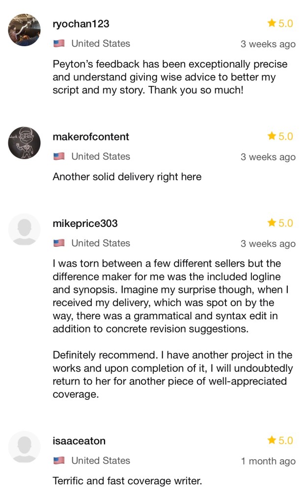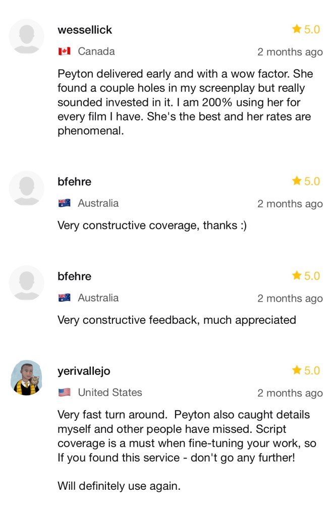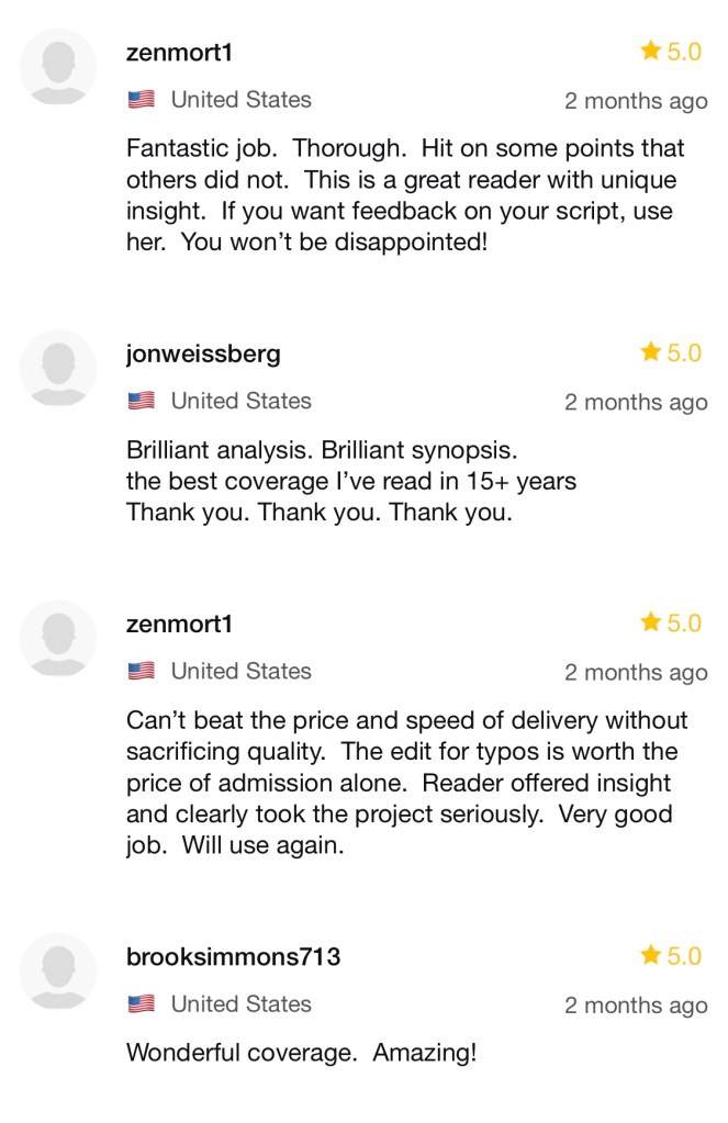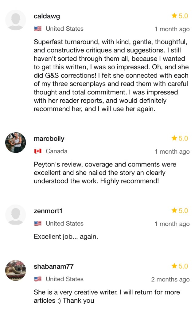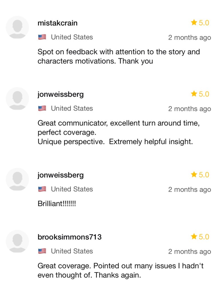 My role as a freelance content writer with an emphasis on writing script coverage for screenwriters and producers started in March 2020. I evaluate and proofread scripts for clients and provide pages of notes outlining in-depth suggestions to strengthen story elements.